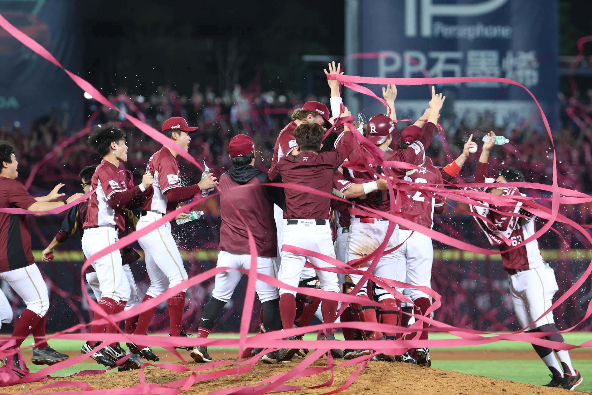 2025CPBL中華電信台灣大賽樂天桃猿把握聽牌優勢,G5從最多4分落後一路追趕,打完9局雙方各拿7分平手,樂天桃猿精神領袖林泓育在11局敲出兩分砲,比賽一錘定音,樂天桃猿以9:7擊敗中信兄弟,團結一心的10號隊友在洲際外野拋下酒紅色彩帶,台灣大賽4勝1敗之姿拿到最後榮譽總冠軍,也是樂天球團接手後首冠。